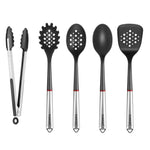 Descubre nuestra línea de herramientas de cocina de acero inoxidable con un toque rojo. La combinación de Nylon y acero le dan a este juego un look más profesional y un desempeño seguro para ocuparlos en tus ollas y sartenes favoritos.